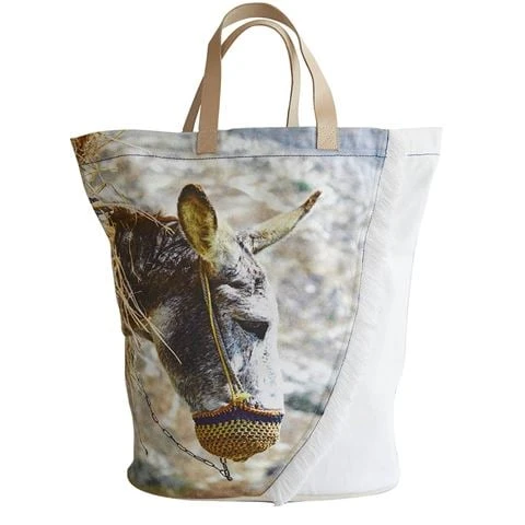 The Maxima Folegandros Tote is decorated with a Con Poulos’ photograph of donkey on Folegandros, Milos, Greece. The tote’s relaxed fringe, slouchy form and top stitching gives this bag an effortless look that goes easily from breakfast to beach’ bar.